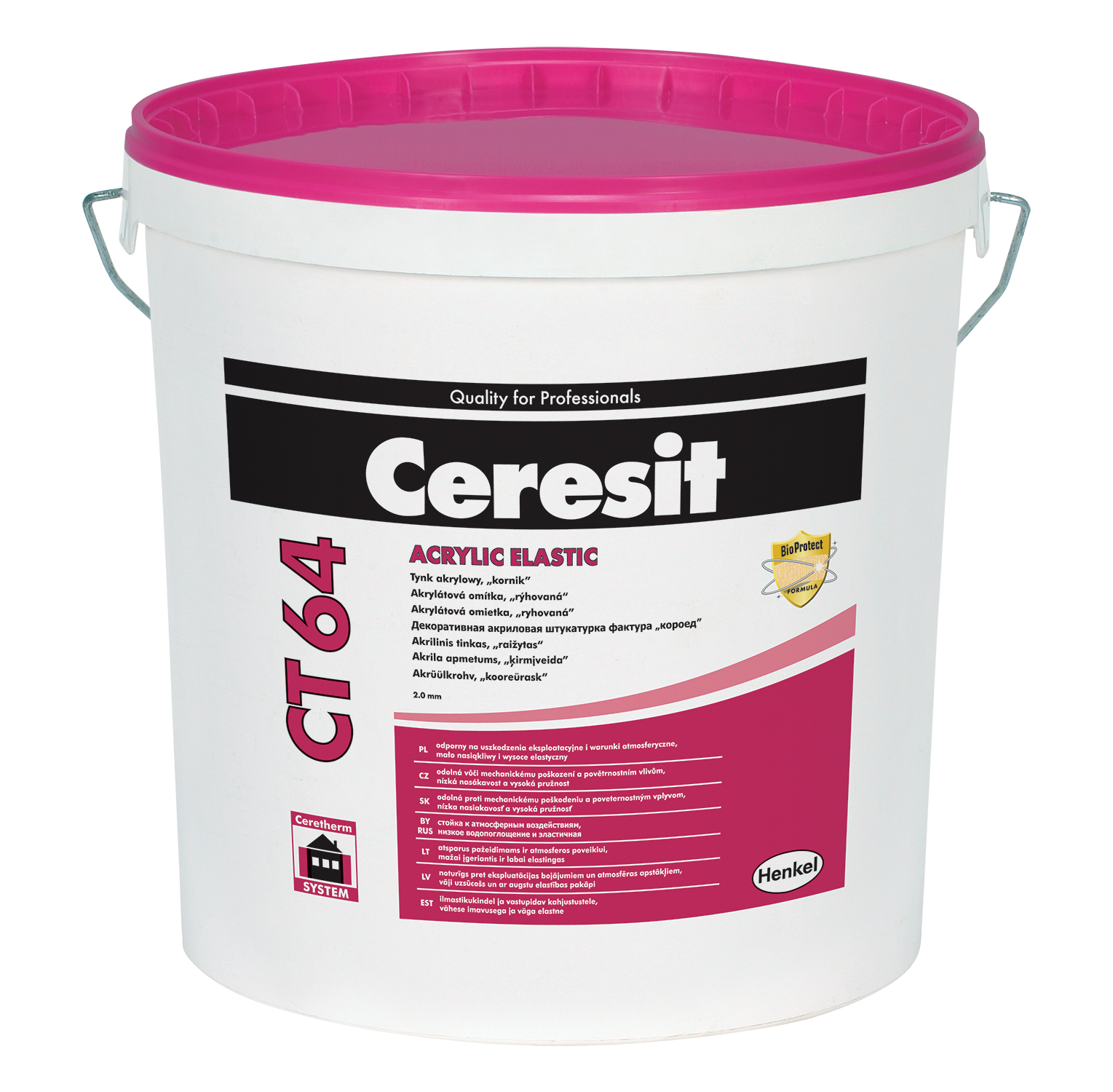 CERESIT® CT 64 e подходяща за нанасяне като еднослойно покритие на бетонни основи, обикновени мазилки, стени с гипсова шпакловка, гипсокартон, гипсофазер и др. Може да се използва се като крайно покритие при изпълнение на система за фасадна топлоизолация CERESIT Ceretherm.